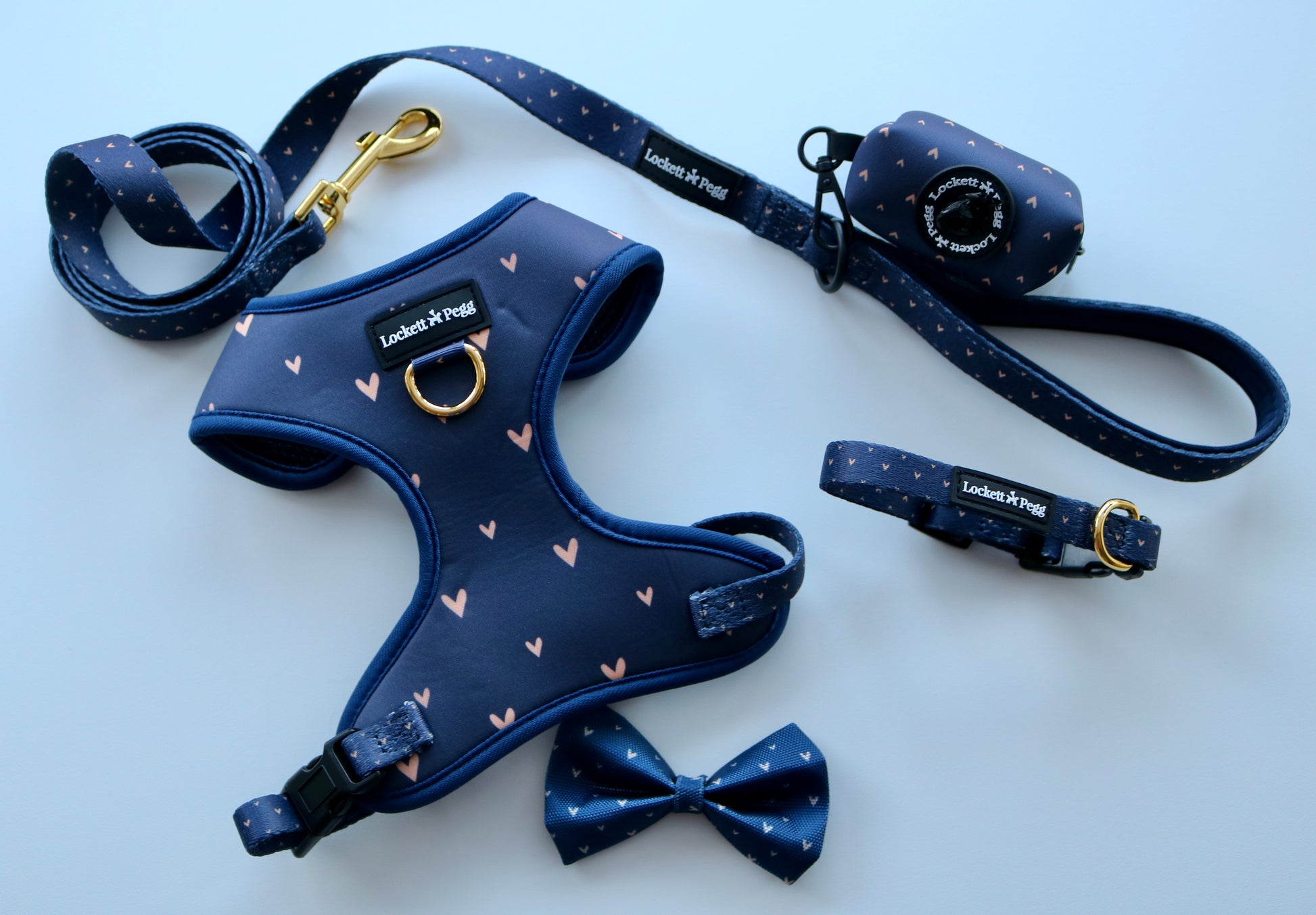 Perfect product to pair with your matching adjustable harness. Part of the Navy Hearts of Gold collection! Featuring a gold metal clip and matte black D-ring.